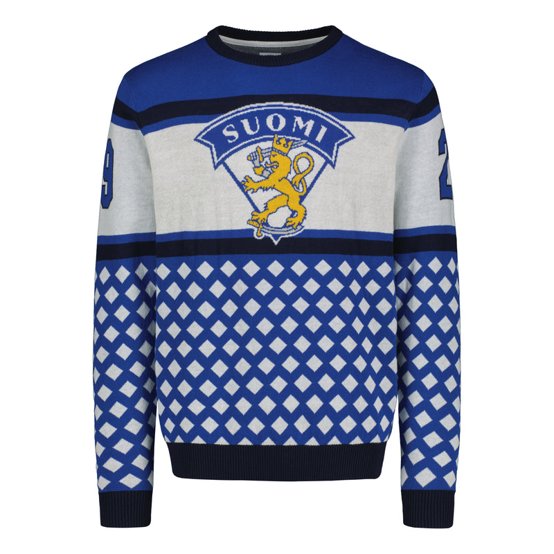 Tummansininen Leijonat neule jatkaa suositun Leijonat talvineuleen tyyliä. Hihoissa tyylikäs vuosiluku 1929, ja pehmeä materiaali pitää lämpimänä talven ja joulun aikaan. Mukava ja monikäyttöinen valinta arkeen ja vapaa-ajalle.
