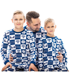 Sinivalkoinen Leijonat-pyjamasetti jatkaa suositun Leijonat pyjamasetin tyyliä. Setti on saatavilla lapsille ja aikuisille. Tyylikäs design sopii arkeen ja vapaa-aikaan kotona. Setti sisältää pitkähihaisen paidan ja housut.