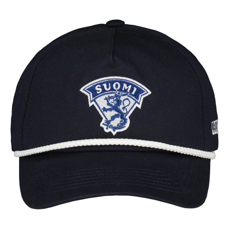 Tummansininen Leijonat Rope Hat tuo trendikkään tyylin mukaan arkeen. Edessä näyttävä Leijonat-logo ja sivussa Leijonat-teksti. Tyylikäs malli viimeistelee rennon asun ja sopii niin arkeen kuin vapaa-aikaan. One Size, säädettävä SR 57.